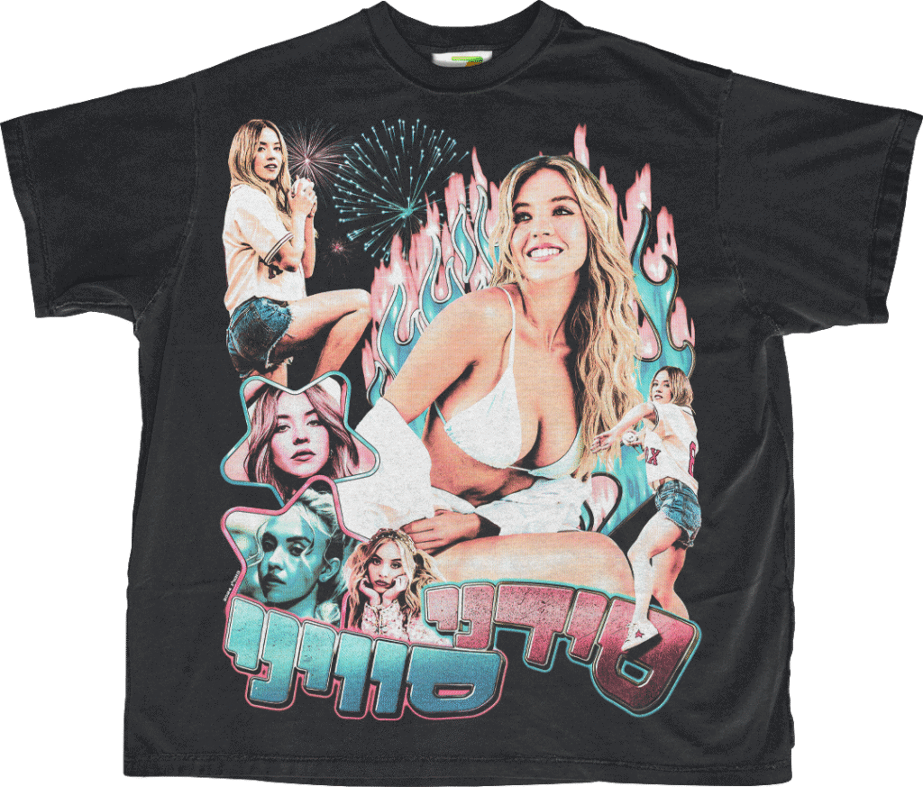 מודפס על חולצת בוטלג בגזרה בוקסית (לא אוברסייזד מדיי), נתפר והודפס בתל אביב, 2025.